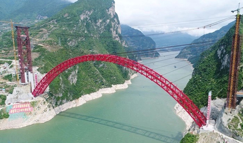 秭歸長江大橋為中承式鋼箱桁架拱橋,主跨531.2米,全長883.2米,采用2×200噸纜索起重機安裝,2018年5月22日主拱合龍。