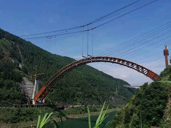 該橋?yàn)榉菍ΨQ上承式鋼管混凝土拱橋,主跨292米,在同類型橋梁中居世界第一,采用跨度865米的2×150噸纜索起重機(jī),在國內(nèi)首次實(shí)施兩片拱肋同時(shí)整節(jié)段吊裝,主拱于2019年7月31日合攏。