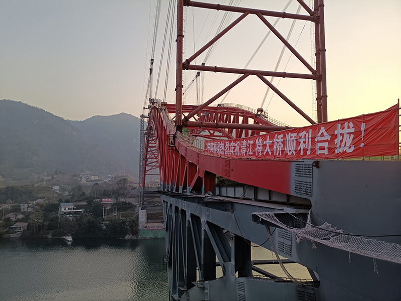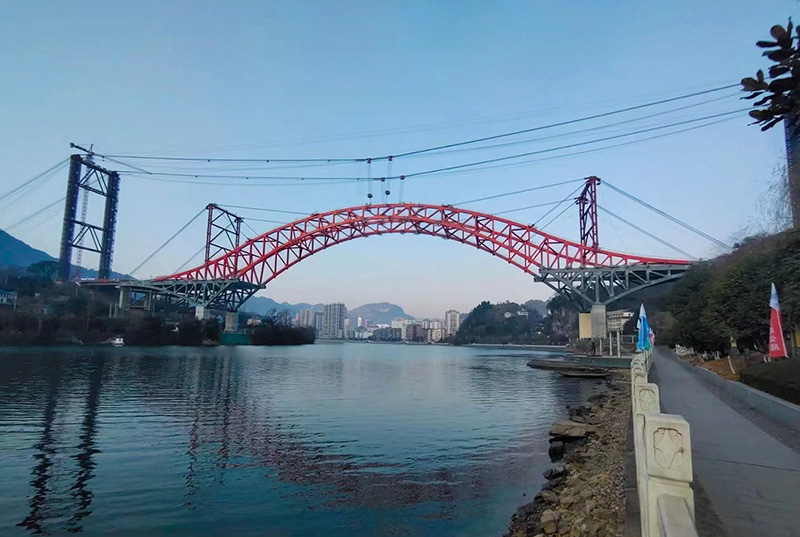 湖北長陽清江特大橋全長354.8m,主橋為320m飛燕式鋼桁架系桿拱橋,采用2*80噸纜索吊機安裝,主拱于2021年1月14日合龍。