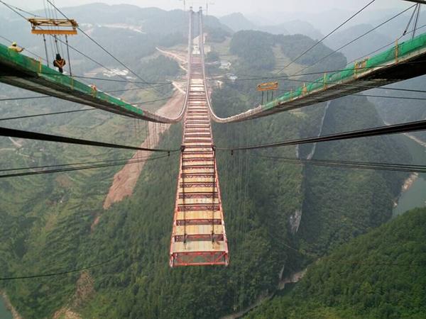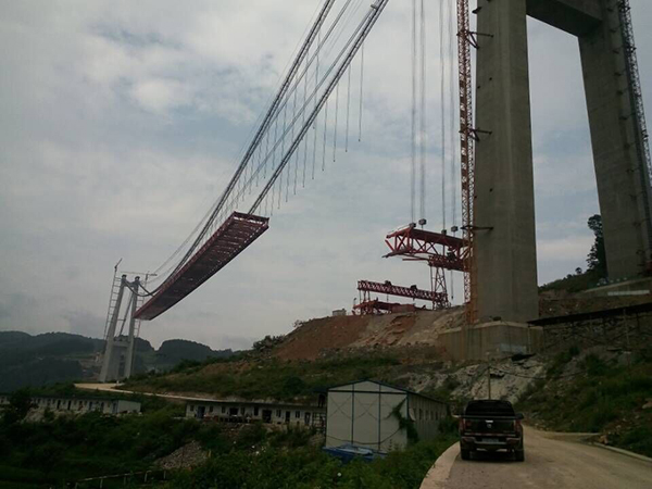貴州貴甕高速清水河特大橋,主橋2178米,主跨為1130米雙塔單跨鋼桁架加勁梁懸索橋,橋高520米,采用2×100噸纜索起重機(jī)安裝加勁梁,建成后成為亞洲山區(qū)懸索橋和世界第二高橋之稱號(hào)。