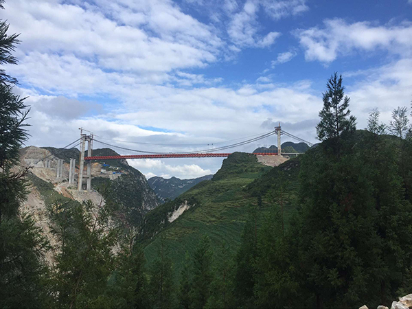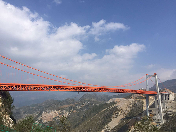貴州畢都高速抵母河特大橋,橋長(zhǎng)1220米,主橋538米,雙塔單跨鋼桁懸索橋,采用2×100噸纜索起重機(jī)配自動(dòng)旋轉(zhuǎn)吊鉤安裝鋼桁梁,節(jié)段重量達(dá)150噸。