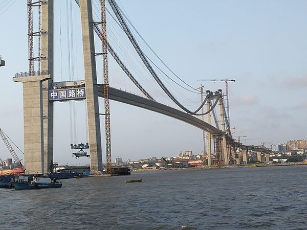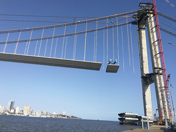 該橋?yàn)殇撓淞簯宜鳂?,主?80米,全長3034米,采用2×125噸纜索起重機(jī)及旋轉(zhuǎn)吊鉤,25天完成橋面鋼梁安裝,該橋建成后成為非洲第一大懸索橋。
