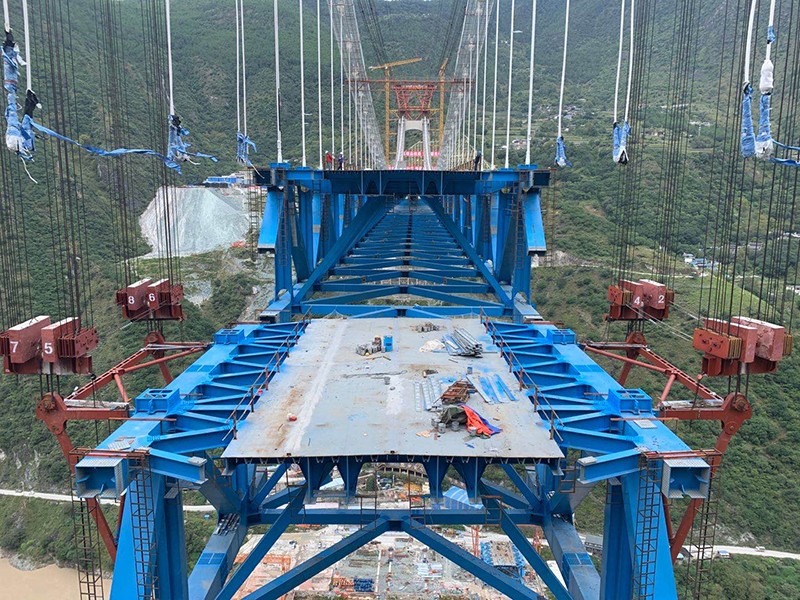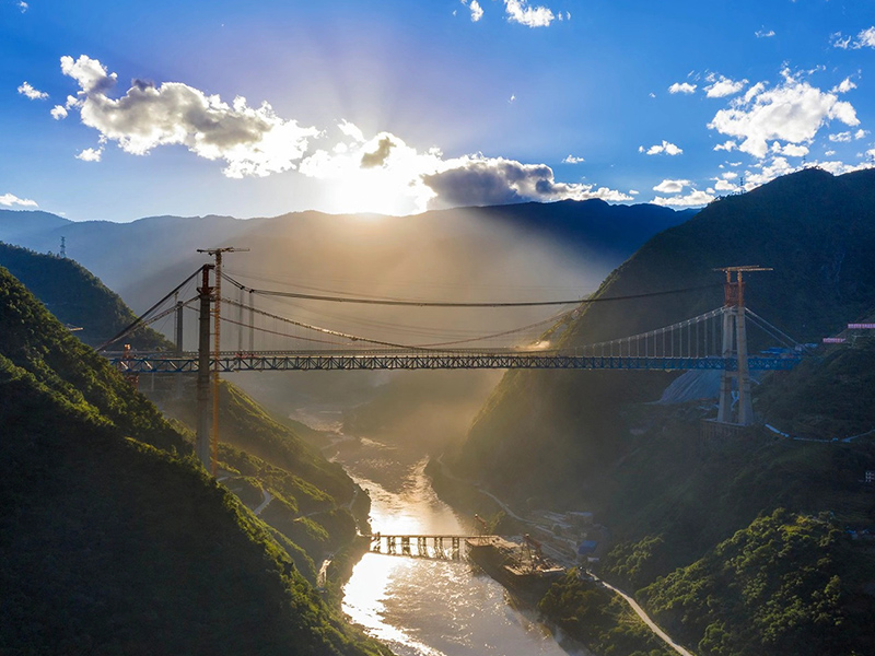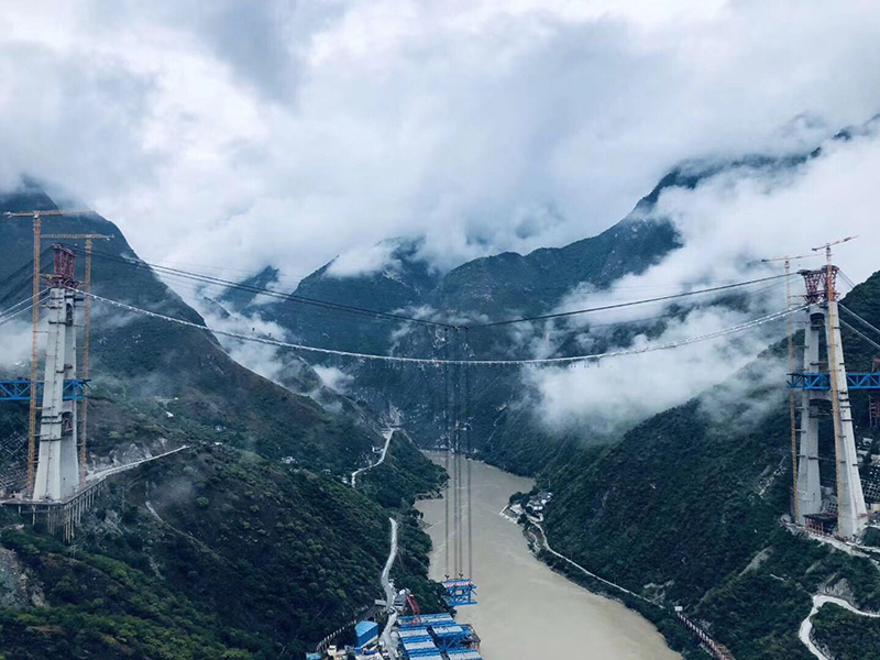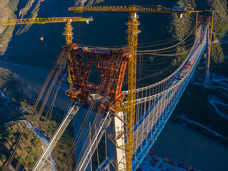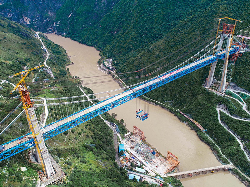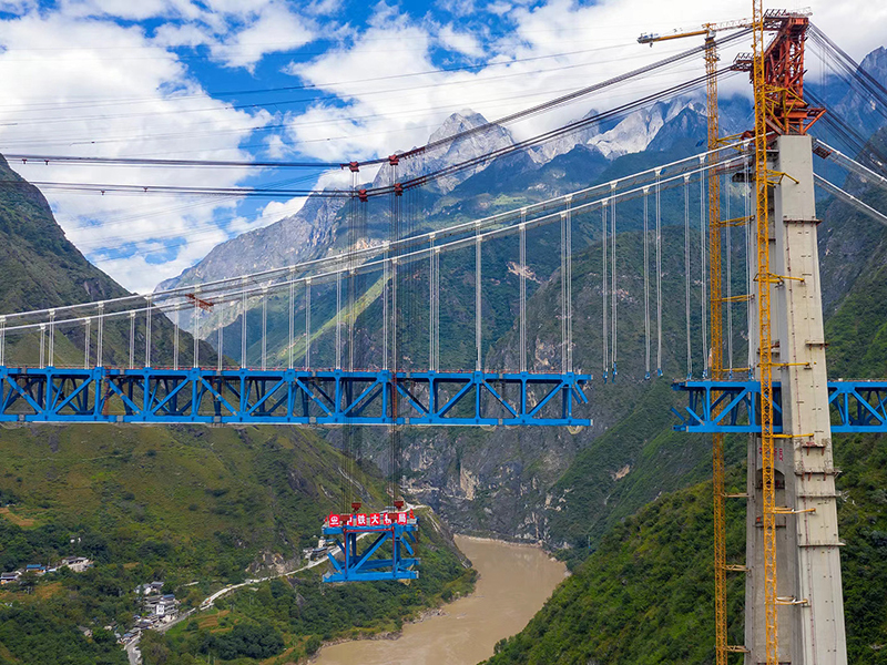 麗香鐵路是連接麗江與香格里拉的“天路”,金沙江特大橋是全線控制性工程。大橋全長882.5米,主跨達(dá)660米,橋面離江面垂直距離約250米。全橋由71個節(jié)間鋼桁梁拼裝組成,單片最大鋼桁梁重量達(dá)640噸,采用最大吊重800噸的纜索起重機進(jìn)行起重吊裝。該橋于2020年11月13日順利合龍。