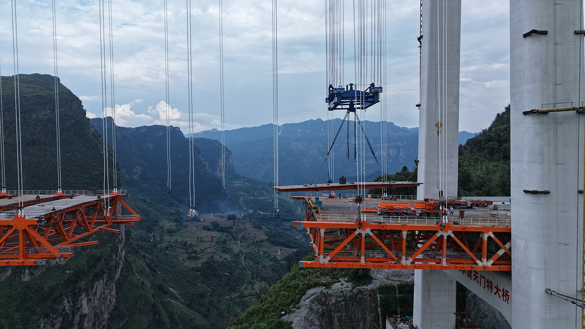 該橋?yàn)橹骺?20米的鋼桁梁懸索橋,全長(zhǎng)1553米,橋面至江面高度差達(dá)560米,是安盤高速公路全線控制性工程之一,采用260t纜索起重機(jī)進(jìn)行安裝,2025年9月23日合龍。